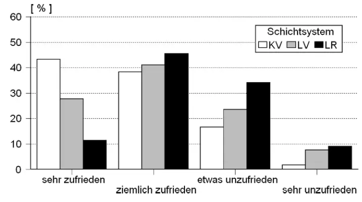 Für die Zufriedenheit mit dem Schichtplan wurden ähnliche Ergebnisse gefunden: Etwa 80% der Befragten mit einem kurz vorwärts rotierten Schichtplan waren sehr oder ziemlich zufrieden mit ihrer Arbeitszeit, wohingegen im lang rückwärts rotierten System nur ca. 55% zufrieden waren: